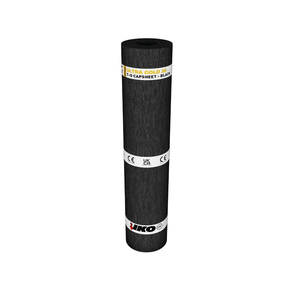 The IKO ULTRA Gold 20 Torch-On Capsheet is a fully bonded, torch-applied, polyester-reinforced, and SBS-modified bitumen capsheet with added fire retardant. It has an upper surface finish of mineral granules and a thermo-fusible film on the underside.