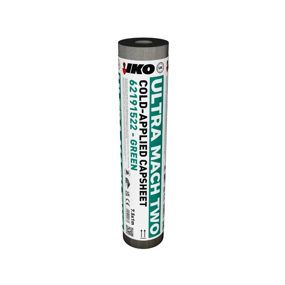The IKO ULTRA Mach Two Cold Applied Capsheet is a polyester-reinforced and SBS-modified bitumen capsheet with added fire retardant. It has an upper surface finish of mineral granules and a fleece finish to the underside to facilitate an adhesive bond.