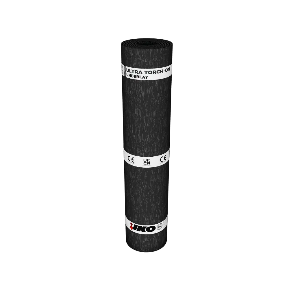 IKO ULTRA Torch-On Underlay consists of a polyester carrier coated with SBS rubber modified bitumen.