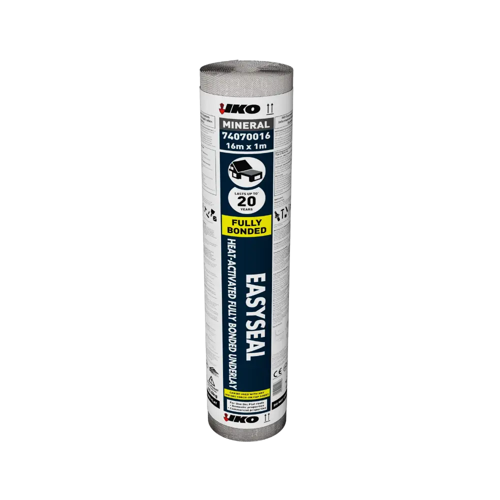 The IKO Easyseal Heat-Activated Fully Bonded Underlay is a high-performance, glass-fibre-reinforced carrier with a heat-activated bitumen SBS elastomeric coating.