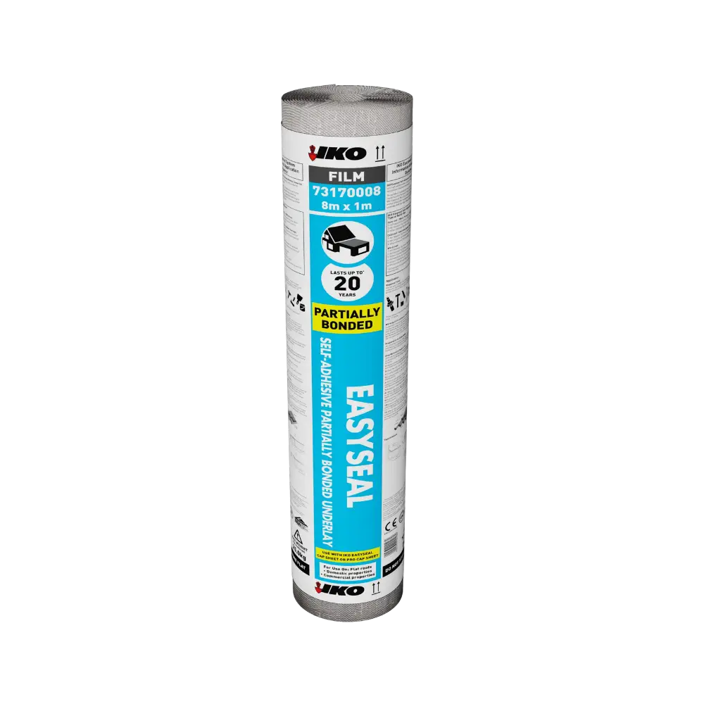 The IKO Easyseal Self-Adhesive Partially Bonded Underlay is only used on main flat roof areas, as it allows for a partial bond to be achieved to the substrate, therefore reducing the risk of blistering from any trapped vapour.