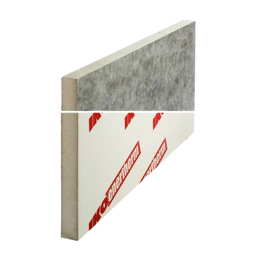 The IKO enertherm BM insulation board is clad on one side with polypropylene-coated bituminous sand and talc-free glass fabric.