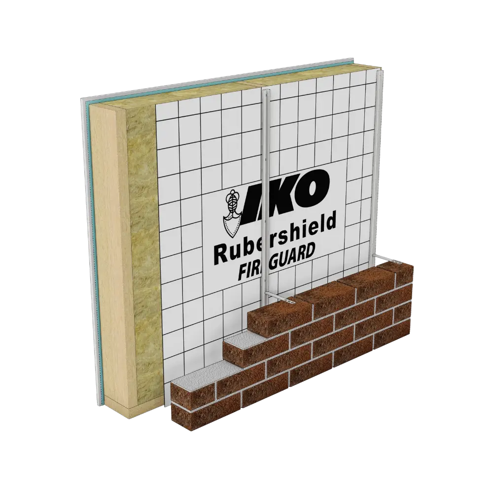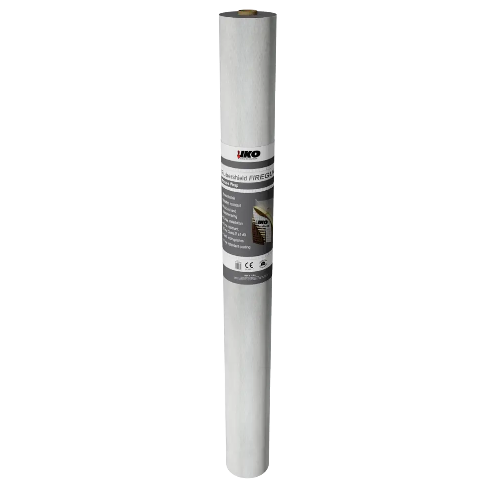 IKO Rubershield Fireguard Housewrap is a 90g/m² low-flammability, vapour-permeable membrane for use within framed wall construction as a house wrap.